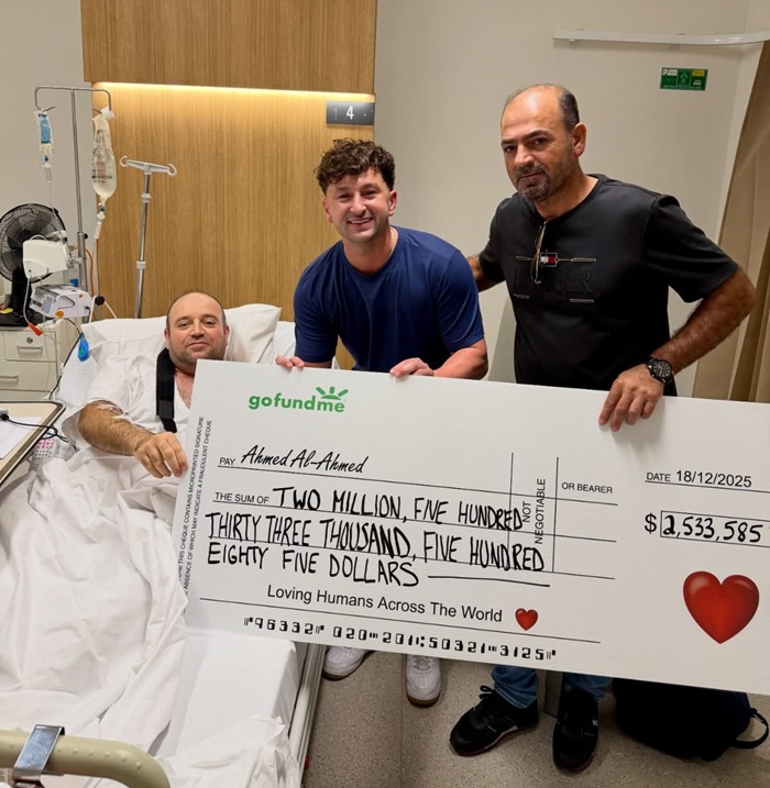 The man who heroically disarmed one of the gunmen responsible for the Bondi terror attack has been presented with a $2.5 million cheque from his hospital bed.
