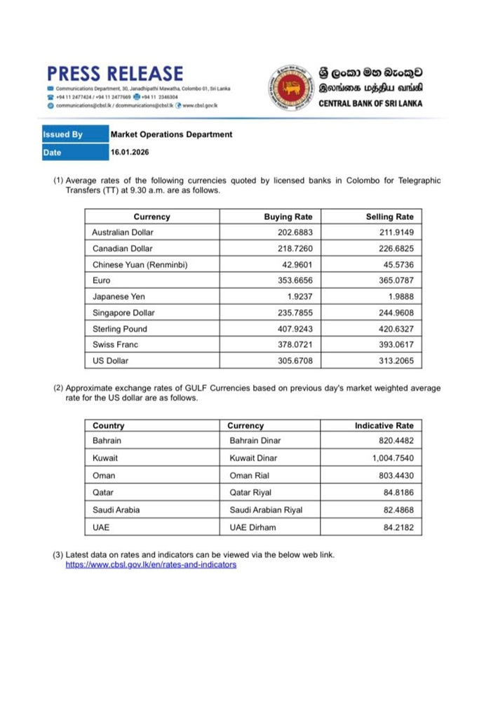 The Sri Lankan Rupee has depreciated further against the US Dollar today (16 Jan), compared to Wednesday.